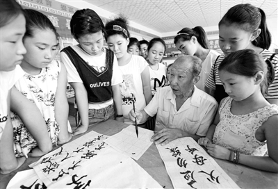 暑假期间,河北省唐山市丰润区左家坞镇政府针对辖区留守儿童多的情况,在镇文化站成立“留守儿童之家”,邀请民间艺人担任“代理家长”轮流值班,教授书法、剪纸、乐器等技艺。新华社记者 杨世尧 摄