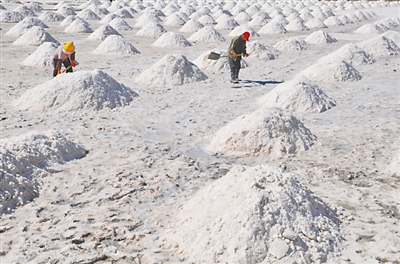 初秋时节,西部大型产盐区甘肃省张掖市高台县盐池原盐进入铲收期,工人将盐池中已晒好的原盐进行集中,装车外运。据《高台县志》记载,高台县自汉代就盛产芒硝和原盐,冬产硝、夏产盐。