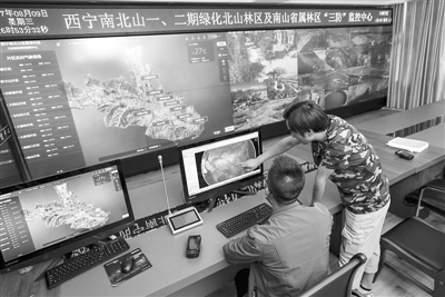 8月9日,青海省西宁市,南北山天然林保护区“三防”监控中心,工作人员正通过林区智能管控系统查看林区周边情况。