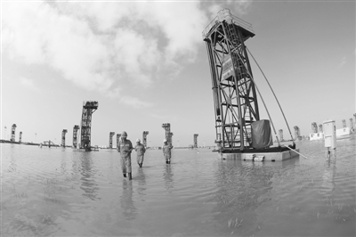 图为在一片汪洋中,工人正在仔细排查隐患。