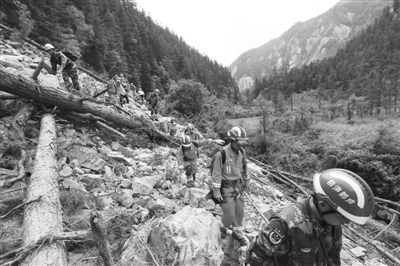 8月10日,一组搜救队伍通过九寨沟景区镜海到五花海的滑坡路段。
