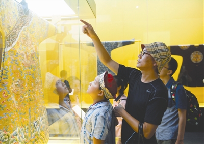 8月10日,观众参观乾隆帝的明黄缎绣云龙纹朝袍。
