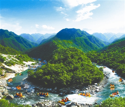 而在宝天曼峡谷漂流景区内,伴随着碎玉般的流水声,漂流游客兴奋而快乐地呼喊声回荡在婉转的青山白云间。