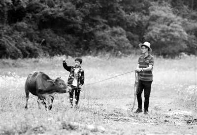 8月11日,刘峻潇(右)在周溪乡凉风村和10岁的王霖枫一起放牛。