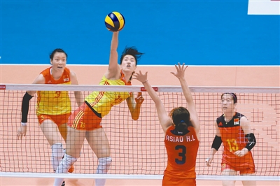 8月14日,中国队球员雷艳溪(左二)在比赛中扣球。当日,在菲律宾进行的亚洲女排锦标赛小组赛中,中国队以3比2战胜中国台北队。