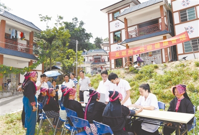 8月15日,在五指山市水满乡新村,水满中心卫生院的医护人员为少数民族群众录入个人医疗健康信息。