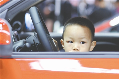 一名儿童在2017第十六届青岛国际车展上“试驾”新车。视觉中国 供图