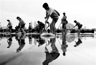 8月16日傍晚,义工们在广西柳州市滨江西路参与清淤。