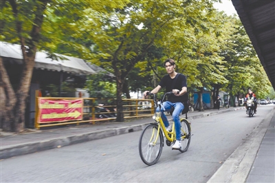 8月15日,在泰国曼谷的泰国国立法政大学,一名学生使用ofo小黄车出行。