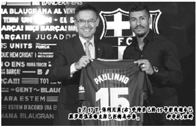8月17日,保利尼奥(右)手持自己的15号新战袍与巴塞罗那俱乐部主席巴托梅乌合影。 新华社/法新