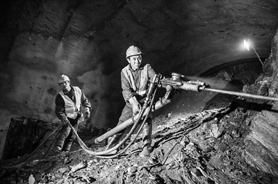 工人们正在岩壁上钻炮眼。