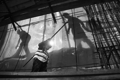 工人们正在隧道内搭建脚手架。
