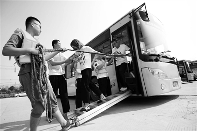 8月21日,在济南公交一分公司二队,“乘客”在驾驶员的引导下有序离开车辆。