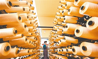 8月21日,山东省沂源县历山街道一纺织企业的工人在生产出口纺织产品。