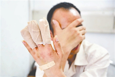 宋英峰刚从陕西出来打工不久,在浙江海宁尖山某地砖厂不幸受了工伤,左手3根手指压伤。对维护自身权益和未来生活如何维系的担忧,让这位中年男子掩面而泣。