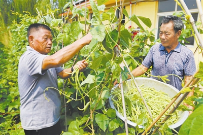8月22日,山东省滨州市沾化区泊头镇敬老院的老人在院内的菜园摘豇豆。