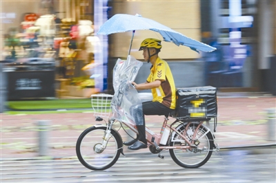 8月23日,台风“天鸽”逼近广东沿海,深圳全市实行停课停工停业停市。临近中午,外卖小哥“风雨兼程”送餐。