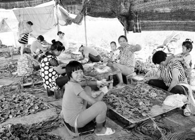 孩子们帮助母亲将一只只长着牡蛎苗或海虹苗的扇贝壳串在养殖绳上。这能帮母亲多赚取几十元收入,他们也体验到劳动的艰辛与父母的不易。