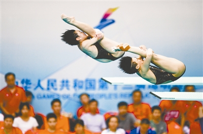 当日,在天津进行的第十三届全运会跳水女子双人三米跳板决赛中,分别来自重庆和湖北的组合施廷懋/昌雅妮以351.30分的总成绩夺得冠军。 新华社记者 李响 摄