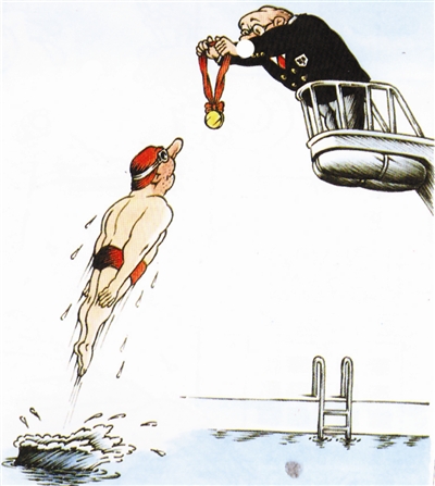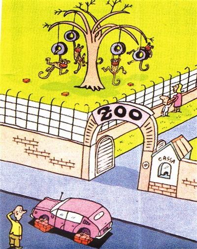 调皮的猴子扒下汽车轮胎挂在树上嘻戏,这本是动物本性的发挥,将其恶作剧策划成漫画作品则显得才智不足且少回味之妙。【匈牙利】科罗曼