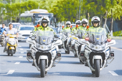 8月23日上午,在四川成都新会展中心门口,10位头戴安全头盔,身穿绿黑色相间的交警制服,手戴黑色手套,骑着警用摩托车的帅气铁骑警,首次亮相。这支交警铁骑警的成员,都是成都市交管局各分局业务骨干。
