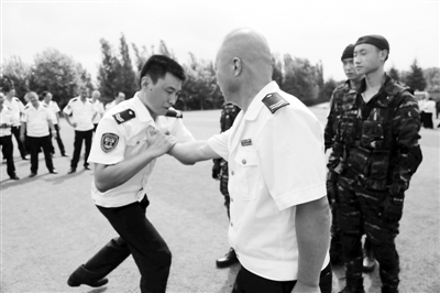 8月23日,武警战士在训练交运集团青岛温馨校车有限公司黄岛分公司驾驶员和照管员擒拿格斗技术。交运集团青岛温馨校车有限公司黄岛分公司对全部200余名校车驾驶员、照管员进行反恐防暴培训及军事训练,提高防卫技能,迎接新学期的校车运营和确保孩子乘车安全。