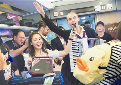 8月26日,来自意大利的歌手在D2216次“爱情专列”上歌唱。当日,上海铁路局首次开行以体验七夕传统文化为主题的D2216次七夕爱情旅游专列。 新华社记者 陈飞 摄