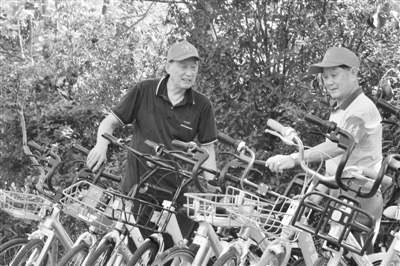 8月24日,退休老党员李延开(右)和沈钊友在整理乱停乱放的共享单车。