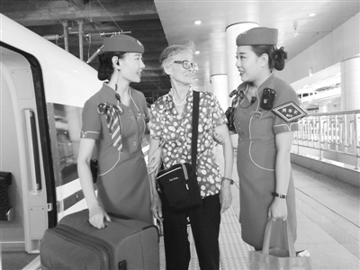 郑州客运段担当128对列车,每天运输旅客24万人左右,为了让旅客有宾至如归的感觉,不断提高服务质量,尤其是针对单独出行的老年人实行了“三多”服务法,即多问一句、多扶一扶、多送一送,深受旅客好评,图为C2952次列车长史钰罕和列车员王丹丹扶老人出站时的情景。