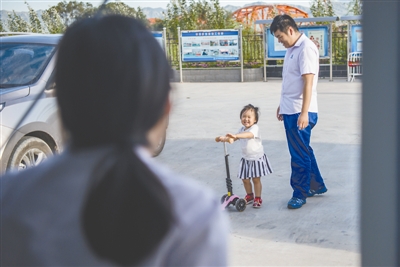 左图:8月23日,河北张家口,在项目工地的宿舍旁,黄佩与妻子带着两岁半的孩子玩耍。