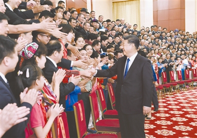 当天上午,天津宾馆会议厅内洋溢着热烈的气氛,参加会见的代表们情绪饱满、精神振奋,有的身穿少数民族盛装,有的胸前佩挂着闪亮的奖牌。11时许,习近平等来到天津宾馆会议厅,全场爆发出雷鸣般的掌声。习近平同参加会见的代表亲切握手,不时交谈并合影留念。