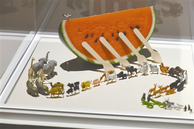 据介绍,日本艺术家田中达也使用来源于生活的各种物品,加上自制的小人偶,创作出一个个充满想象力的“微型世界”场景。展览将持续到9月10日。图为作品“西瓜诺亚方舟”。