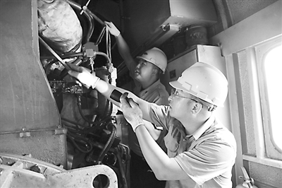 近日来,集宁地区高温不减,集宁机务段集宁整备车间铁路职工对入库机车进行整备作业,保证暑运机车质量良好。纪恩泉 摄