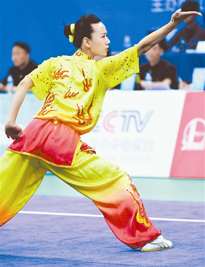 8月29日,第十三届全运会武术套路比赛在天津理工大学体育馆继续进行。经过一天的比赛,来自河北的阚文聪获得女子长拳剑术枪术全能金牌。图为阚文聪的长拳比赛。 本报记者 许之丰 摄
