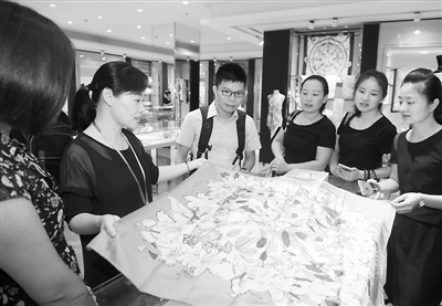8月30日,在浙江杭州一家商店,销售人员向厦门来的客商展示一款丝巾。