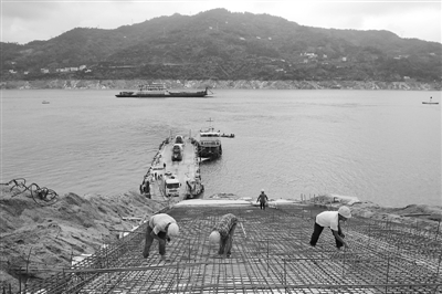 8月30日,施工人员在三峡大坝上游湖北省秭归县江段库岸进行加固施工。