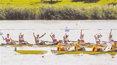 8月30日,天津全运会赛艇项目比赛在天津市吉兆桥段正式收官,男子八人单桨有舵手比赛中,广东队由倪旭林、李东健、曲晓明、王林青、梁伟雄、程王龙、张建华、张超、吕毅夺得冠军。这是队员们到达终点时庆祝夺冠。