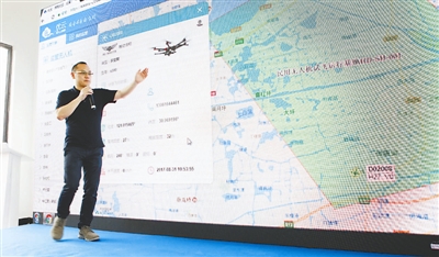 8月31日,基地工作人员在启动仪式上介绍基地使用的低空空域民用无人机飞行管理动态大数据云系统。当日,国内首个民用无人机试飞运行基地在上海青浦现代农业园区内启用。