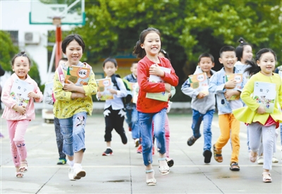 8月30日,在江苏省淮安市盱眙县实验小学,孩子们拿着刚领取的课本,迎接新学期的到来。
