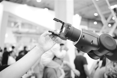 展厅里有一幕让记者印象深刻:一个工业机器人挥舞着红色的机械手臂向人群招手致意,围观的小朋友纷纷伸出手来与其击掌。