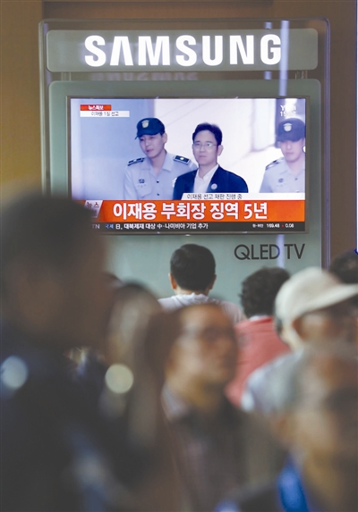 当地时间2017年8月25日,韩国首尔,韩国法院对三星电子副会长李在镕行贿案作出一审判决,民众观看电视报道。东方IC 供图