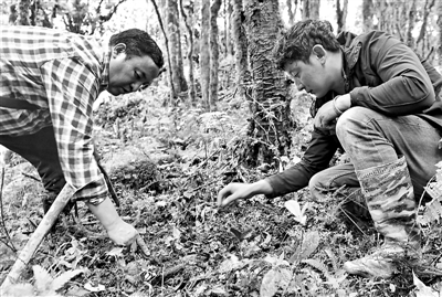 9月3日,次旦扎西(左)在墨脱镇朗杰岗村林地和村民一起栽培药材金线莲。
