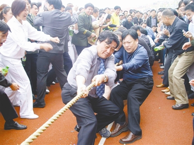 娃哈哈创业十七周年暨公司第六届职工运动会,图为宗庆后参加拔河赛