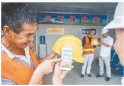 8月31日,江苏省高邮市,中铁北京工程局连镇(连云港至徐州)铁路项目工地上,农民工正在展示安全帽上的二维码,通过手机扫描登录,即可了解相关的安全知识。据了解,系统里大部分课件时间控制在6至12分钟,内容包含安全文化、安全法制、安全制度与检查标准、安全技术等课件,采用动漫、讲故事和微电影等喜闻乐见的方式讲解,简单易懂。