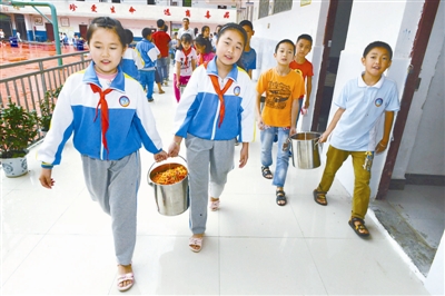 9月6日,贵州省黔东南苗族侗族自治州剑河县第四小学的学生在搬运免费“营养午餐”。