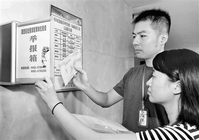 9月6日,厦门市湖里区纪委派驻纪检组工作人员在禾山街道监督举报箱前收取群众举报信。