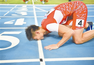 9月7日,张培萌在比赛后亲吻跑道。新华社记者 许畅 摄