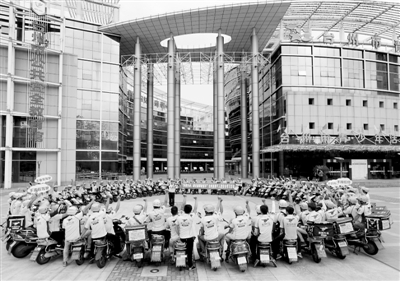 9月7日,浙江台州市公共安全教育馆前的广场上,百名美团外卖小哥宣誓不逆向行驶、不酒后驾驶、不疲劳驾驶、不闯红灯、不争道抢道,争当文明交通的参与者和维护者。