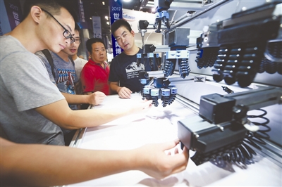 9月10日,参观者在物联网应用和产品展览会上体验柔触机器人的敏感程度。