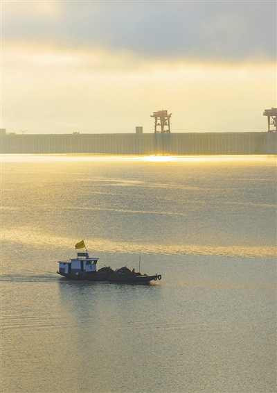 9月11日,清漂人员在三峡大坝前清理水上漂浮物。